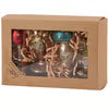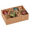 A glass ornament set displaying vintage style mushroom designs with glitter accents that coordinate well with décor . Set features 4 mushrooms with different colored caps and shapes attached to decorative metal clasps with silver tinsel at the base. Our glass Vintage Mushroom ornaments are packaged together in a kraft paper box with acrylic window to easily view ornaments. A set of nature-themed home accents perfect for everyday display.