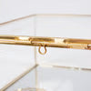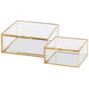 A set of decorative hinged boxes including 2 individually sized rectangle shapes made with glass and brass trim for an antique style. Each hinged box features a mirror bottom and brass chain to hold lid open with a latch to secure closed. Our glass Square hinged box set is a unique vintage inspired home accent perfect for storing daily keepsakes or decorative items.