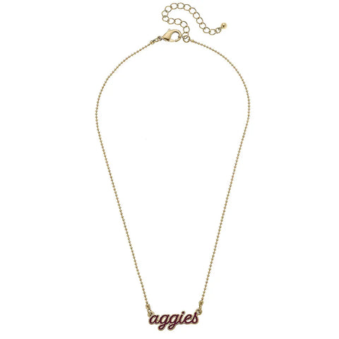 Represent your team in style with this Texas A&M Aggies Enamel Script Necklace in Maroon! Perfect for game day (or any day), this necklace features the iconic "aggies" script. Show off your spirit with this dainty accessory.